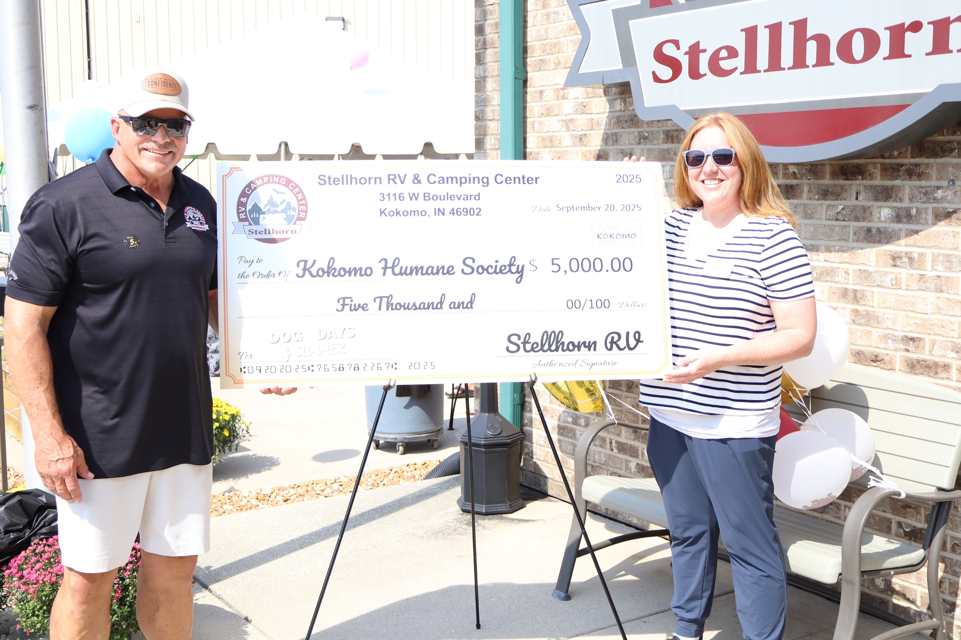 Doug Stellhorn (owner of Stellhorn RV & Camping Center) donates $5,000 to the Kokomo Humane Society during Stellhorn RV’s event in Kokomo, Indiana - highlighting the local RV dealer’s commitment to community support and animal welfare.