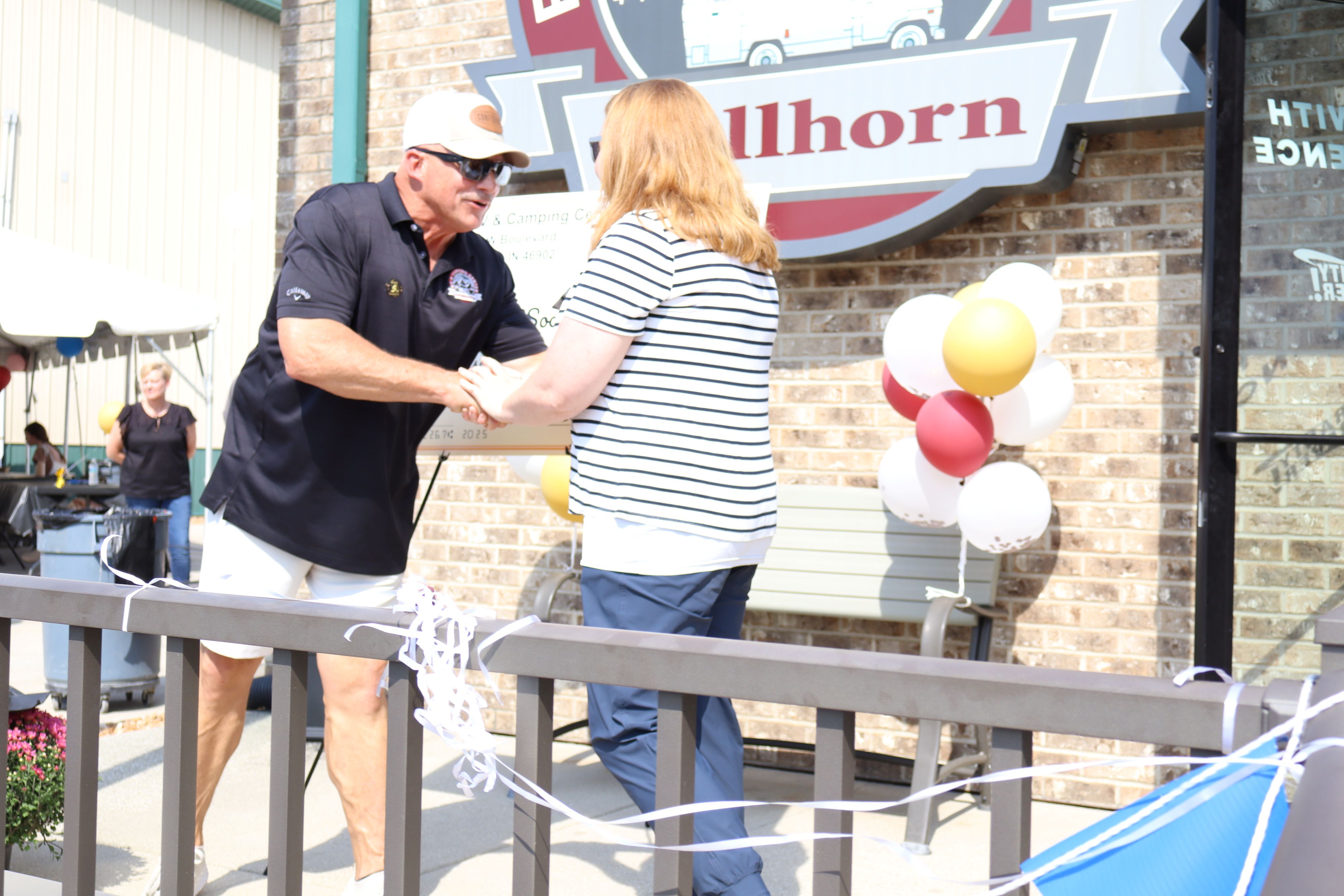 Doug Stellhorn, owner of Stellhorn RV & Camping Center in Kokomo, Indiana, presents a $5,000 donation to the Kokomo Humane Society during the dealership’s community event.